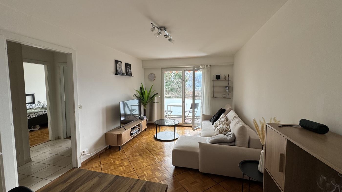Composé comme suit : hall d'entrée avec armoire murale, cuisine fermée, équipée, salon avec balcon, une chambre, salle de bains-WC et vue dégagée sur lac et montagnes.